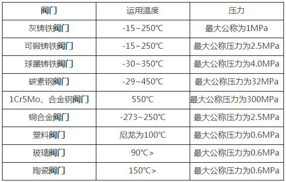 常見閥門運用溫度及壓力一覽表
